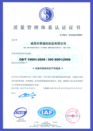 我公司先后順利通過ITS人權(quán)和產(chǎn)能評(píng)估,獲得國際羊毛局WOOLMARK標(biāo)志的使用權(quán)。產(chǎn)品也通過了歐洲SGS檢測(cè)。 視產(chǎn)品質(zhì)量為企業(yè)生命,把客戶要求作為我們的工作目標(biāo),公司總經(jīng)理王喜成先生愿與國內(nèi)外客商密切合作,共求發(fā)展。